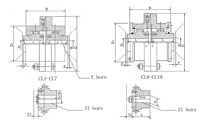 Features and applications: With a small amount of axis offset compensation performance, can not buffer, reduce vibration. The outer shape is small, theoretically, the transmission torque is large, and it needs lubrication and sealing, but the noise is large and the price is expensive, and it is used for connecting the horizontal two coaxial line shaft transmission. It is used to connect two horizontal coaxial lines under low speed and heavy load conditions, such as metallurgical machinery and heavy machinery. CL and CLZ type are spur gear type, which is used for low speed and heavy load. The two horizontal shafts are connected. The straight tooth type compensation performance is poor. It is a eliminated type and has been replaced by drum type gear. It should not be used again.